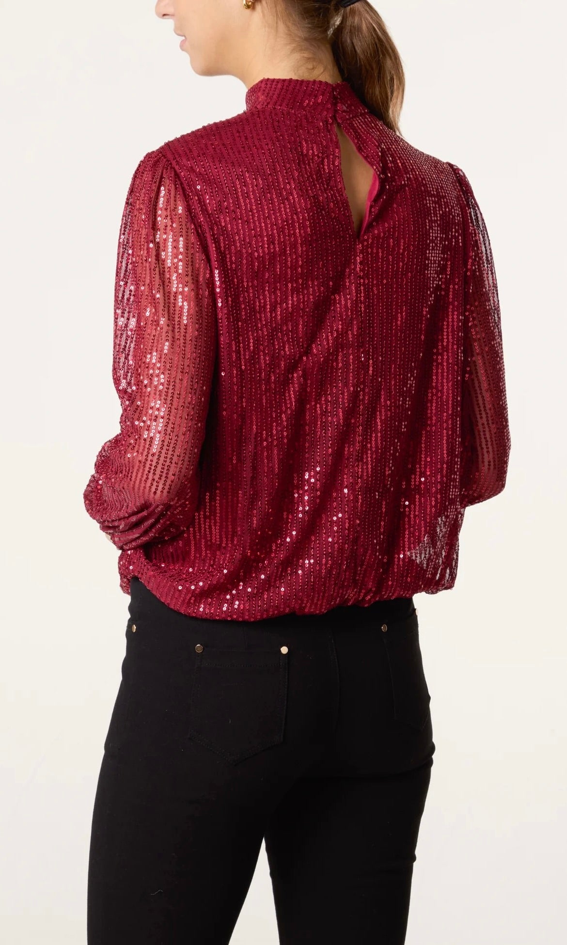 WINE SEQUIN HIGH NECK PUFFBALL TOP