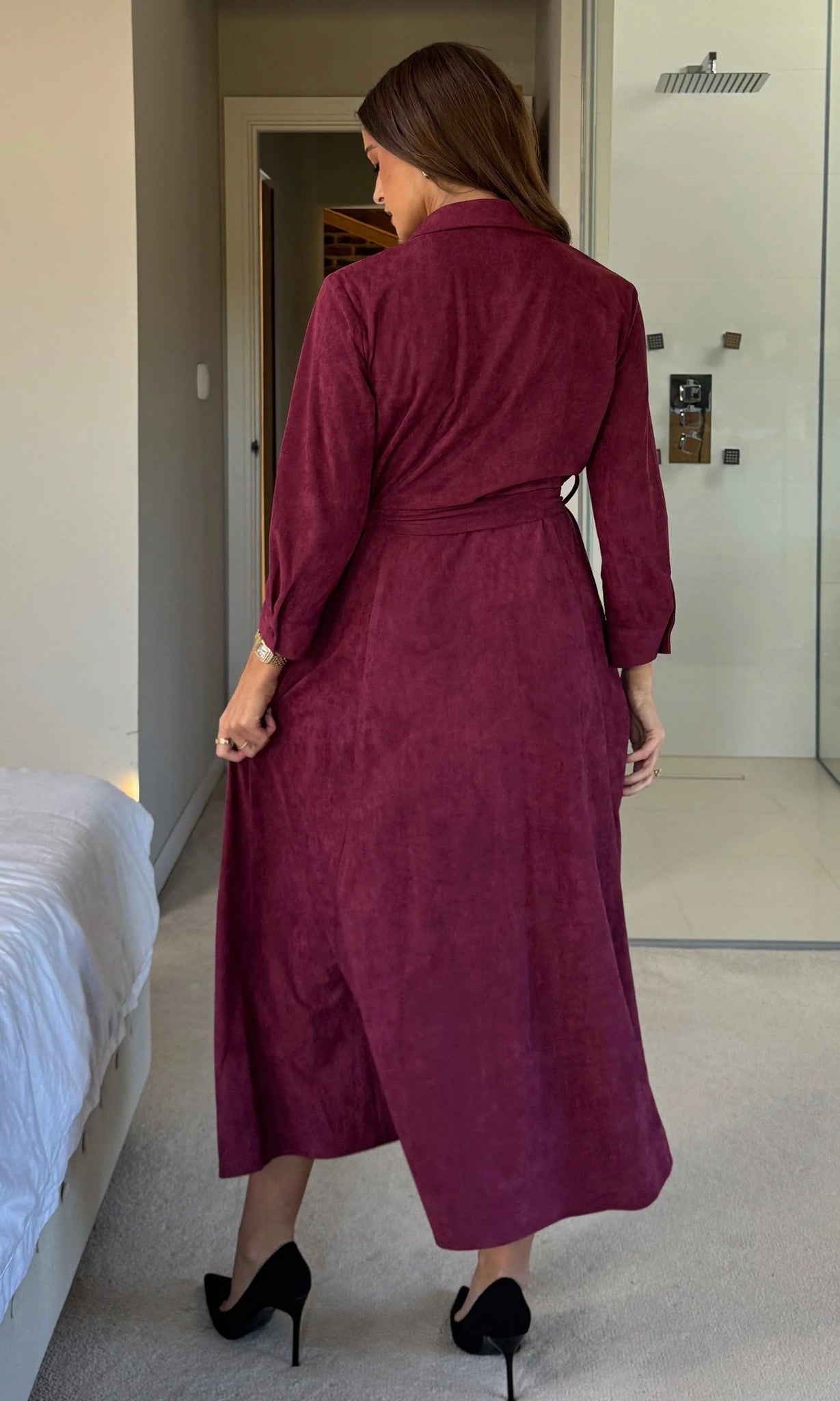 Angela Long Sleeve Maxi Shirt Dress Berry Suede