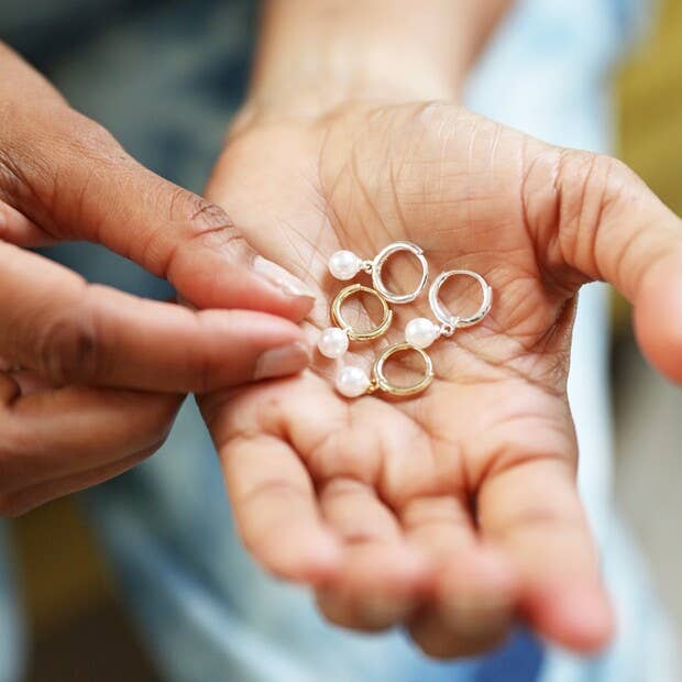 These cute dainty huggie hoop earrings make a wonderful addition to your everyday jewellery collection. The stylish pearl charm will add a hint of glamour to your every day summer style. The earrings have a secure clip fastening and are great to pair with other fabulous earrings to create a curated ear look or by themselves. Dimensions width 12mm x height 20mm Made from Silver:sterling silver plated brass, glass pearl Gold:14ct gold plated brass, gold plated sterling silver clip fastening, glass pearl
