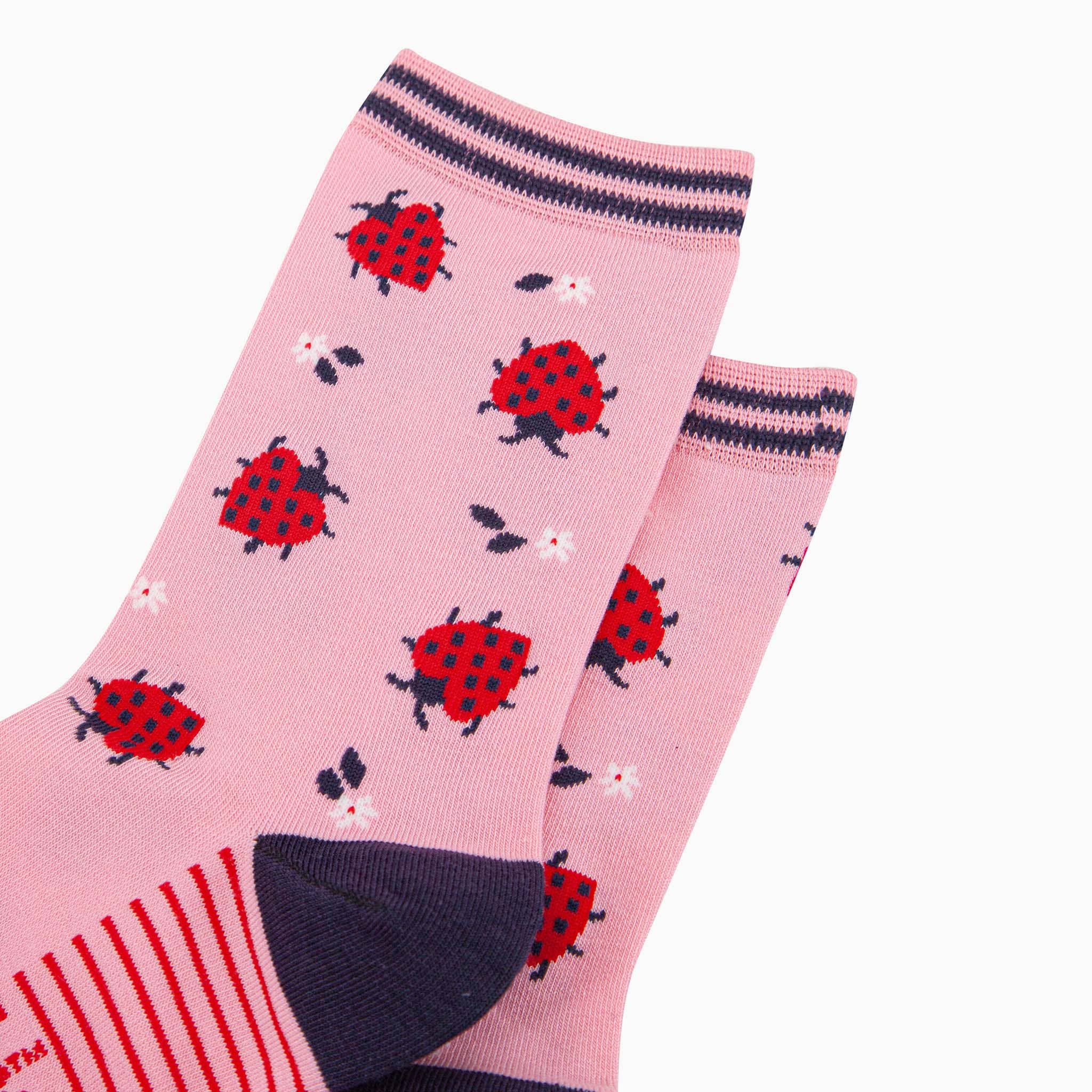 Designed in the UK, these red ladybird socks are crafted from naturally breathable bamboo. Showcasing cute red ladybirds on a light pink sock with a contrasting navy heel and toe. These socks are eco-friendly and feel luxuriously soft.