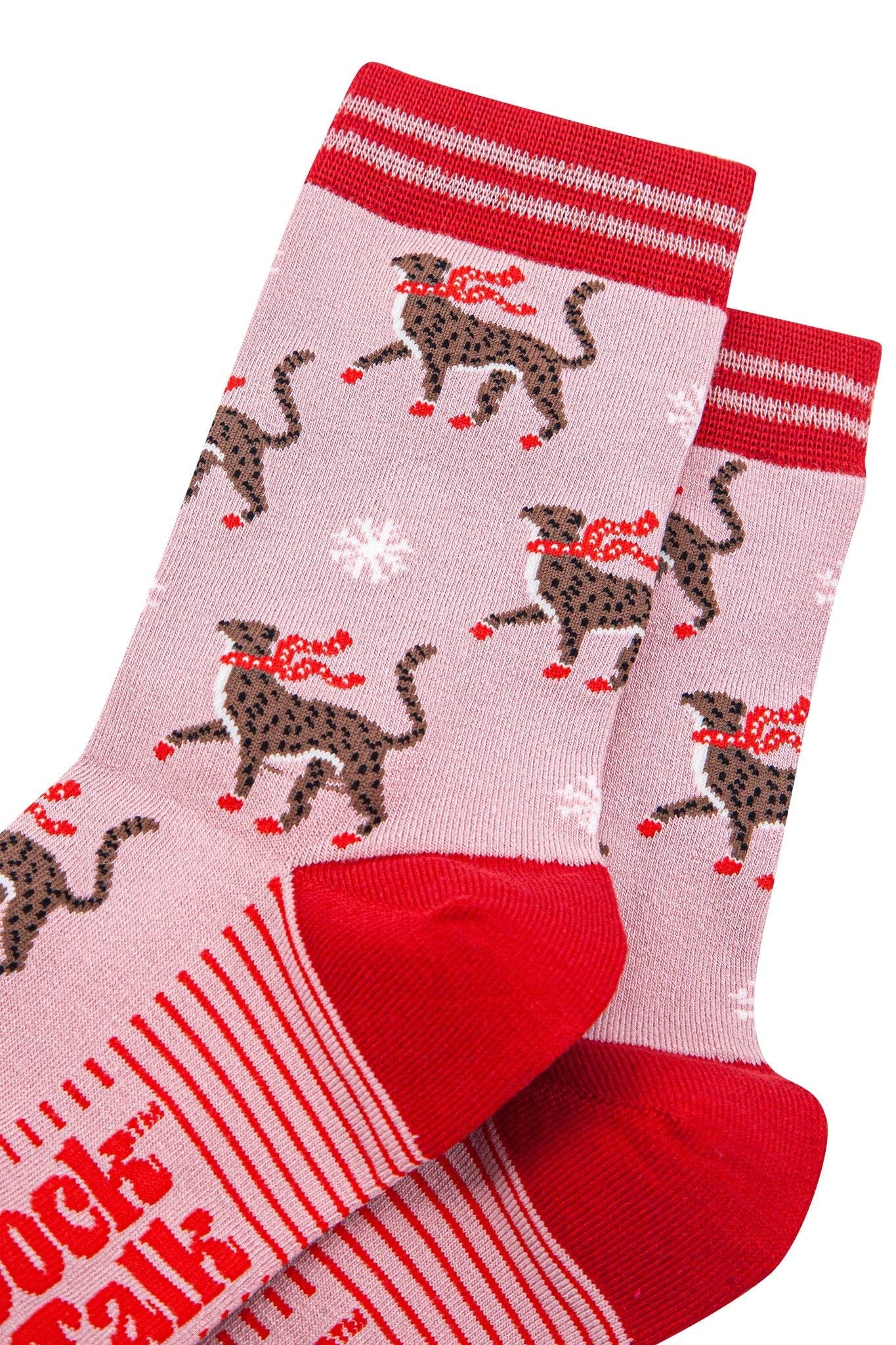 A seasonal variation of our much loved cheetah design. These festive socks feature snowflakes and beautiful cheetahs wearing winter scarves and snow boots. Made from sustainable sourced bamboo fibre these socks are designed for exceptional breathability and comfort. Finished with a classic striped cuff for a luxurious fit.