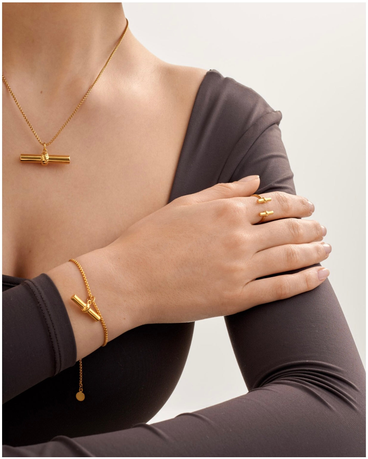 Our Themis T-Bar Ring is made from durable 18K Gold PVD coating, making it certified waterproof, sweat-proof, and life-proof. Featuring a sleek double T-bar design that is utterly timeless, it stands out solo or pairs beautifully with the matching necklace, earrings, and bracelet. Presented in a reusable suedette pouch, it's ideal for gifting or taking with you on the go.