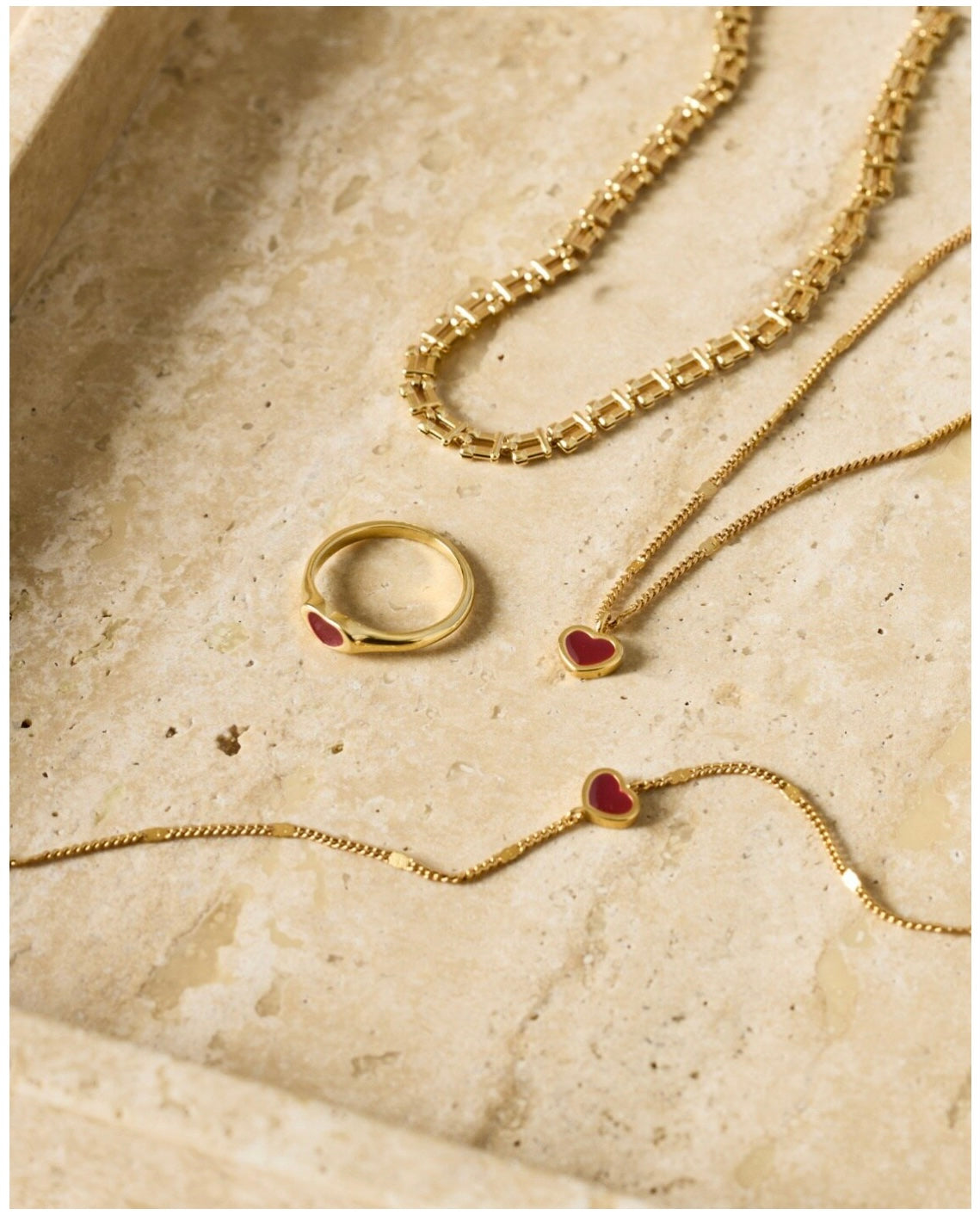 Our Rouge Heart Ring is made from durable 18K Gold PVD coating, making it certified waterproof, sweat-proof, and life-proof. Finished with a red enamel heart charm, it adds a touch of romance to your everyday look, especially when paired with the matching bracelet and necklace. Presented in a reusable suedette pouch, it's ideal for gifting or taking with you on the go.