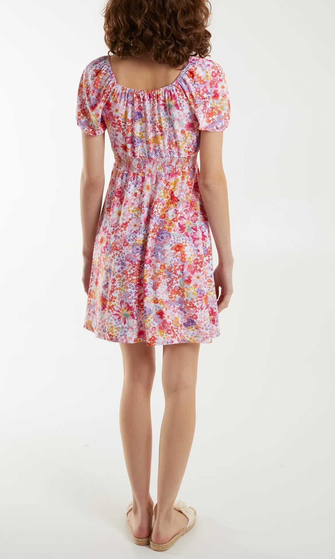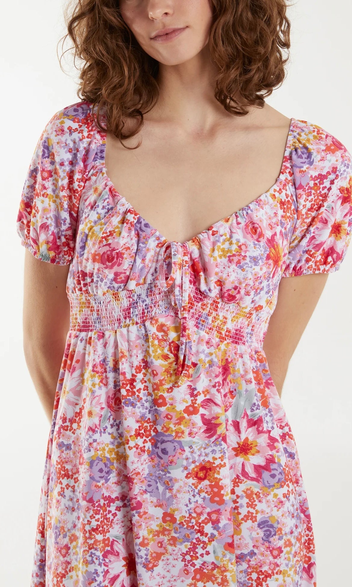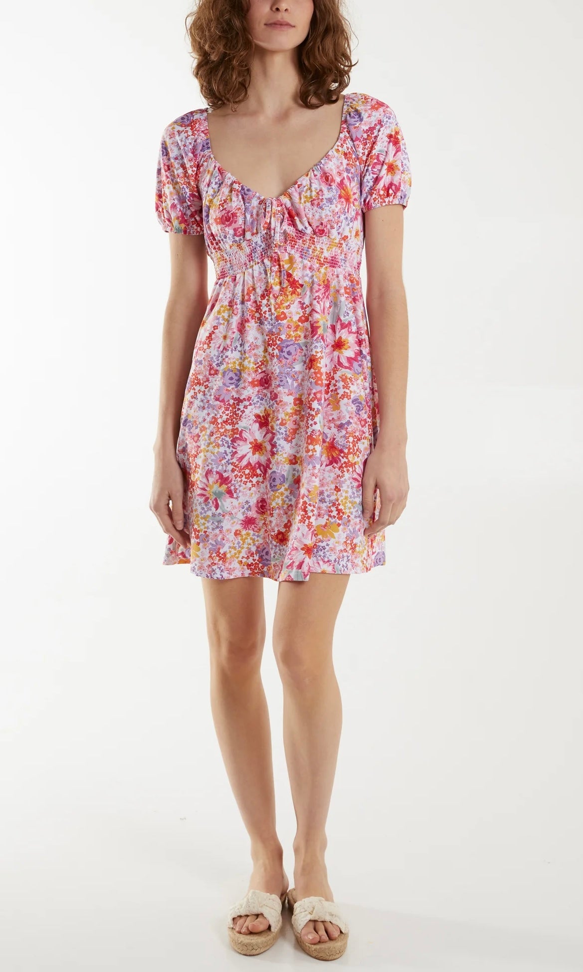 PINK SWEETHEART NECKLINE FLORAL STRETCH MINI DRESS