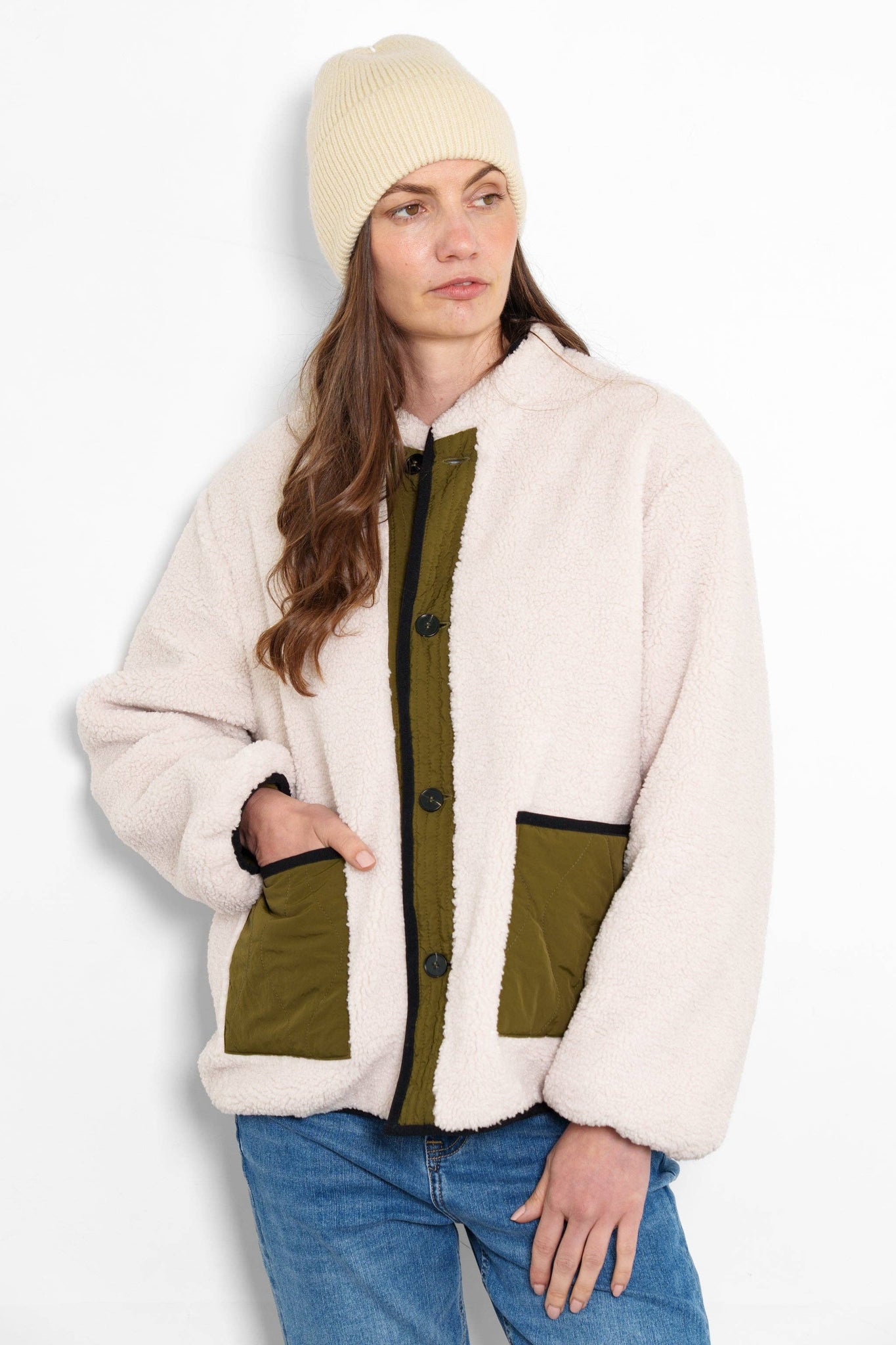 ๐ HIS PIECE A reversible short winter jacket featuring a quilted khaki shell on one side and cream Borg fleece lining on the other. Featuring buttons on the front and convenient side pockets. This piece is designed for seasonal versatility and comfort. Round neck Long sleeve Regular length Regular fit ๐งต FABRIC Crafted from soft cotton fleece and polyester for a warm feel. cream fleece body :100% cotton Made in China