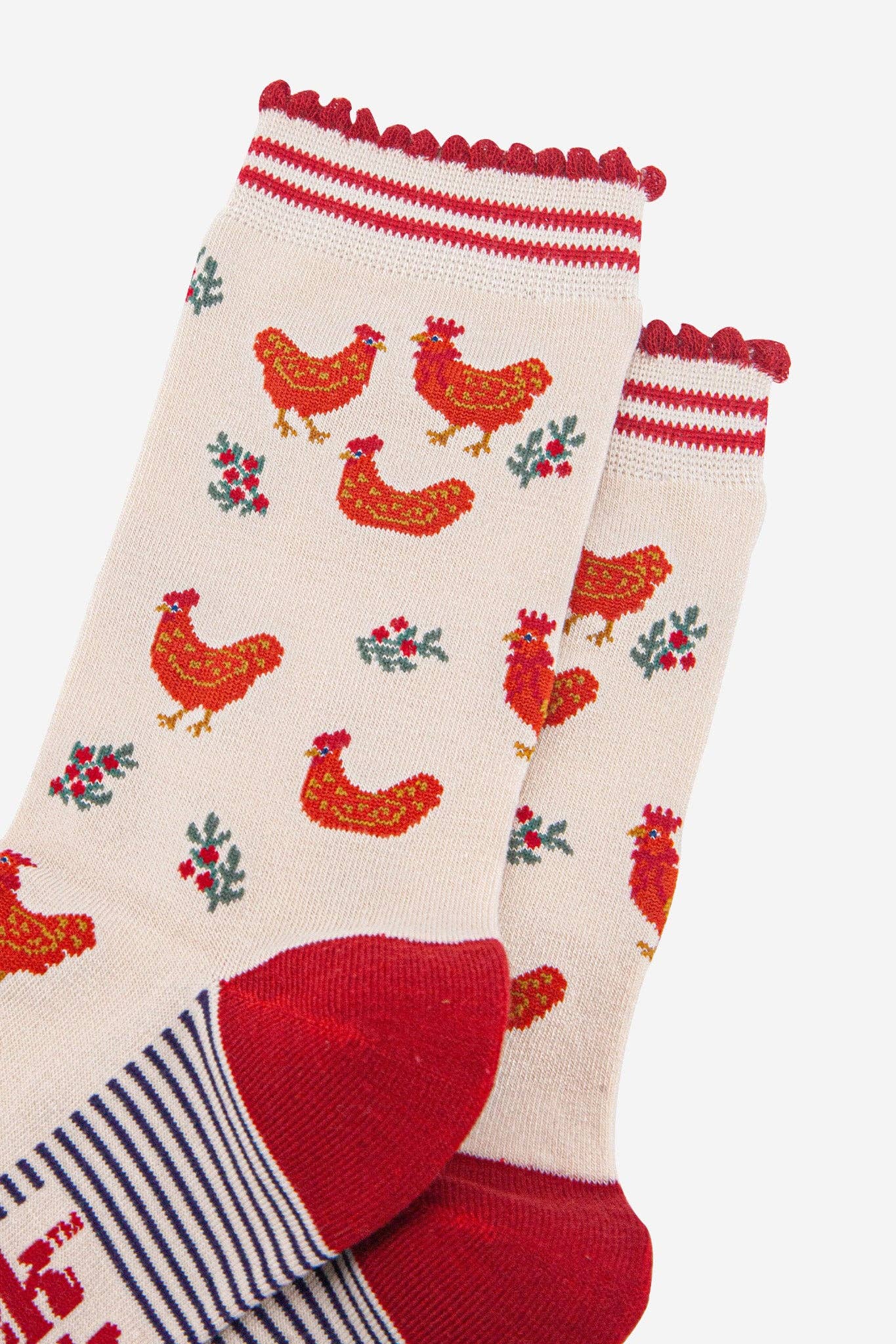 These delightful Christmas socks feature festive hens wearing party hats and seasonal holly. Made from sustainably sourced bamboo these navy ankle socks provide exceptional comfort and breathability. Finished with a soft scalloped striped cuff for a luxurious fit.